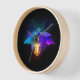 Antique, mechanical firefly with light bulb and thin wings glows orange, purple, turquoise on black background. Steampunk style.