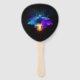 Antique, mechanical firefly with light bulb and thin wings glows orange, purple, turquoise on black background. Steampunk style.