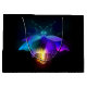 Antique, mechanical firefly with light bulb and thin wings glows orange, purple, turquoise on black background. Steampunk style.