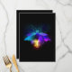 Antique, mechanical firefly with light bulb and thin wings glows orange, purple, turquoise on black background. Steampunk style.