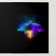 Antique, mechanical firefly with light bulb and thin wings glows orange, purple, turquoise on black background. Steampunk style.