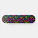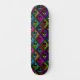 This image is a seamless, repeating pattern featuring stylised black skulls with brightly coloured details, set against a background of sharp, intersecting geometric lines. The skulls are depicted frontally, with large eye sockets and teeth visible, filled with vibrant neon colours like electric blue, hot pink, bright yellow, and vivid green. The background is composed of squares formed by radiating and intersecting lines in a spectrum of neon shades, including pink, purple, blue, green, yellow, and orange, all on a black base. The interplay of the black skulls and the glowing neon lines creates a bold, high-contrast, and visually striking effect, reminiscent of synthwave or retro-futuristic aesthetics combined with a modern gothic theme.