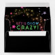 5x7 black glow party envelope lined with bright, random stars that look like glitter in shades of silver, gold, red, pink, and purple. Reads 'Let's Glow Crazy!' in neon lights effect blue, green and pink letters. Cute, festive party envelopes for glow in the dark birthdays, neon party colours, black light party, girls birthday party, etc. We have coordinating glow in the dark party invitations and black light birthday supplies in our Zazzle.com/angela65* shop.