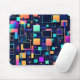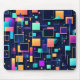 A chaotic yet visually appealing abstract pattern featuring a multitude of colourful squares, rectangles, and lines. The shapes overlap and intersect, creating a sense of depth and movement. The predominant colours are neon shades of pink, orange, yellow, blue, and purple, set against a dark background. The overall effect is both energetic and mesmerising.