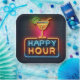 Bright neon lights display the message "Happy Hour" and cocktail graphic on a brick wall background