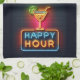 Bright neon lights display the message "Happy Hour" and cocktail graphic on a brick wall background