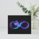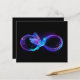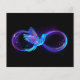 Glowing, purple infinity symbol with flying, luminous, blue hummingbird on black background. Neon.
