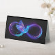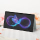 Glowing, purple infinity symbol with flying, luminous, blue hummingbird on black background. Neon.