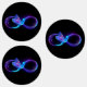 Glowing, purple infinity symbol with flying, luminous, blue hummingbird on black background. Neon.