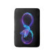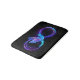Glowing, purple infinity symbol with flying, luminous, blue hummingbird on black background. Neon.