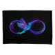 Glowing, purple infinity symbol with flying, luminous, blue hummingbird on black background. Neon.