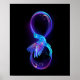 Glowing, purple infinity symbol with flying, luminous, blue hummingbird on black background. Neon.