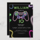 Celebrate a Level 10 milestone with this vibrant neon video game birthday invitation. Featuring a glowing neon game console at the center, the design is enhanced with minimal neon accents in green, yellow, and pink tones. The bold gaming atmosphere creates an exciting and energetic vibe, perfect for young gamers. This modern and eye-catching invitation is ideal for a fun, high energy video game themed birthday party.