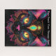This mesmerizing jigsaw puzzle features a majestic cat illuminated with glowing neon mandala patterns. The intricate, symmetrical designs flow across its fur in vibrant hues of electric colours, a fiery orange, and magenta . The cat's piercing turquoise eyes seem to glow with mystic energy, drawing you into its enigmatic gaze. Set against a deep black background, the vivid lines and radiant details create a dazzling contrast, making each puzzle piece a work of art. A stunning blend of fantasy and elegance, perfect for those who love cats, colour, and cosmic mystery.