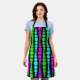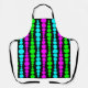 This apron has a mid-century modern design of neon pink, green, and blue rounded rectangles in increasing and decreasing size running vertically on a field of black.