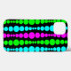 This phone case has a mid-century modern design of neon pink, green, and blue rounded rectangles in increasing and decreasing size running vertically on a field of black.