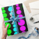 This wrapping paper has a mid-century modern design of neon pink, green, and blue rounded rectangles in increasing and decreasing size running vertically on a field of black.