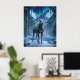 A towering neon moose stands proudly in a futuristic boreal grid forest, crafted from armored fur textures, glowing body lines, and radiant antlers branching like energy networks. Cyan, emerald, silver, and electric blue tones illuminate its massive frame. Digital pine trees, snow-dusted ground, misty air, reflective ice, distant mountains, and northern lights create an epic wilderness atmosphere. This bold woodland design blends strength, nature, and cyber style, ideal for cabins, offices, gaming rooms, and moose lovers.