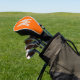 Golf Head Cover with a neon orange solid background and bold white font Simple and trendy design by Alma Wad. Personalise it with your monogram now.