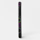 This phone case has a geometric design of groups of three ovals in neon colours scattered about on a field of black.