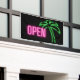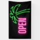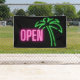 Neon pink "Open" text with neon green tropical palm tree silhouette on black background makes this a great design for personal and a variety of retail stores and businesses
