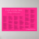 This seating chart combines functionality with a visually stunning design. The alphabetical order ensures that guests can effortlessly find their assigned seats, while the neon pink background and clear, legible typography make a captivating visual impact.