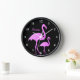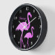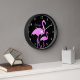 Neon pink flamingo wall clock with custom name. Personalised wall decor with trendy tropical bird design. Fun gift idea for flamingo lover / collector. Perfect for business, club, cafe, bar, restaurant, kitchen, office space, hall etc. Black or white wood trim. Big 10 inch size round clocks.