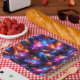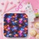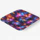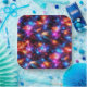 Vibrant neon abstract polygon shapes bursting with explosive sparks on a striking black background.