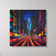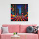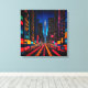 A vibrant cityscape transformed into an abstract kaleidoscope of geometric patterns. Skyscrapers become prisms of light, refracting vibrant neon blues, magentas, and yellows against a smoky night sky. Traffic lights and headlights merge into trails of liquid colour that streak across the scene. The composition balances symmetry and chaos, with sharp, angular lines dissolving into soft blurs in the distance.