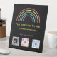 Stay connected with customers or groups using this tabletop pedestal sign that features a neon rainbow graphic with customisable text and social media qr codes on black background