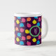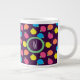 Stylised roses in bright neon pink, blue, yellow, and coral with neon green leaves are spangled across a deep purple background to create a fun floral pattern. This mug is available in jumbo, espresso, and bone china sizes and styles. Customise the monogram with your initial to make this mug your own.