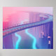 Neon pink and cobalt bridge arcs over a luminous chasm with a shimmering river, blending sci fi wonder with dreamlike surrealism and a bold cyber glow.