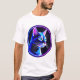 The sleek outline of the cat, brought to life with vibrant shades of blue and purple, radiates a modern, futuristic vibe. The cosmic-inspired background, dotted with subtle stars, adds a mysterious galactic atmosphere. Perfect for cat lovers and fans of neon aesthetics