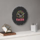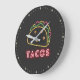 Neon red "Tacos" text with neon crunchy shell taco silhouette on black background with grey dot clock face. Who doesn't love tacos?