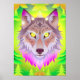 Colourful digital illustration of a wolf's face with vibrant neon colours and abstract forest background.