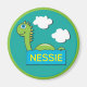An adorable green loch ness monster with green scales on his back, with the name Nessie.