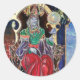 Colourful, vibrant , contemporary  painting in gold ,blue,red,green,brown colours . A mysterious hypnotic sorcerer with elegant gorgeous red velvet costumes holding a magic sphere  sitting on a gothic throne with gargoyles and an owl. Ambient is surreal,fantastic ,alchemic where you see a jester is drinking from a cup, a templar monk flying on a frog,transparent bubbles,fantasy landscapes with hell fire,cosmic blue sky with stars , mountains of heaven,trees .Egg Tempera on wooden panel with golden foil. 1989 , Miniature Made with pictorical techniques of 1300 by Alessandro Lumini (c) It is also a beautiful fantasy design for Christmas,Holiday,Birthday,New Year's Eve day, Mardi Gras and Carnival greetings.