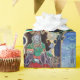 Colourful, vibrant , contemporary painting in gold ,blue,red,green,brown colours . A mysterious hypnotic sorcerer with elegant gorgeous red velvet costumes holding a magic sphere sitting on a gothic throne with gargoyles and an owl. Ambient is surreal,fantastic ,alchemic where you see a jester is drinking from a cup, a templar monk flying on a frog,transparent bubbles,fantasy landscapes with hell fire,cosmic blue sky with stars , mountains of heaven,trees .Egg Tempera on wooden panel with golden foil. 1989 , Miniature Made with pictorical techniques of 1300 by Alessandro Lumini (c) It is also a beautiful fantasy design for Christmas,Holiday,Birthday,New Year's Eve day, Mardi Gras and Carnival greetings.