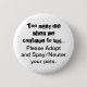 Too Many Die...Please Adopt Spay and Neuter pets buttons: Pet overpopulation is a serious problem throughout the world. Does it break your heart to see dogs, cats and other animals bred and sold in pet stores when there are so many pets in animal shelters that need homes? Does it disturb you to see unwanted puppies and kittens born because of people who didn't want to bother with getting the mama and papa dogs, cats and any other animals spayed and neutered? Well this design is for you! Text is "Too many die when we continue to buy... Please Adopt and Spay/Neuter your pets.". These buttons are also great for animal rights activists.