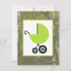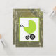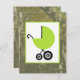 A neutral unisex baby shower invitation featuring an illustration of a green baby carriage over a background of camo. Personalise the text on back with details of your occasion.