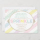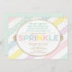 This baby sprinkle invitation for a gender neutral shower features glittery text and confetti with a cute stripe background pattern in multicolored rainbow and gold. The backside design is a solid mint green colour that matches the front. Your guests will love this modern design.