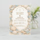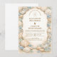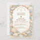 A refined coastal wedding design featuring an elegant oval wreath of seashells, oyster shells, starfish, and soft sea glass accents. Neutral sandy tones blend with muted ocean blues and delicate dune grasses to create a serene seaside aesthetic. The warm parchment background enhances the natural textures while maintaining a timeless, elevated feel. Perfect for a romantic beach celebration with classic coastal charm.