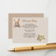This adorable baby shower insert card has a sweet poem asking your guests to bring Books for Baby as a special gift. The design features a whimsical teddy bear reading a book and a stack of childrens books. The background has a white lattice work pattern. The reverse side has a darker brown lattice pattern and a teddy bear sitting reading a book.