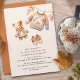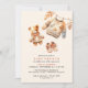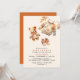 Cute autumn baby shower invitations with watercolor illustrations of a teddy bear and cosy baby clothes. Off-white ivory colour with a bright burnt orange. Gender neutral design is perfect for a baby boy or a baby girl.