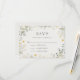 Wedding RSVP cards featuring elegant wildflower wreath on neutral colour background.