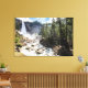 This photo features late winter at Nevada Falls is in full flow and the water thunders off the cliff face and takes up again in the merced river as it passes rocks and fir trees.