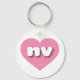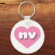 This keychain features a calm cool pink heart containing the bold, white, lower case letters nv, a playful abbreviation for the state of Nevada, the silver state.