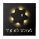 For Yom HaShoah, Holocaust Remembrance Day. A black and yellow fractal image recalling the yellow "Star of David" which the Nazis required Jews to wear during the Holocaust. Hebrew text reading, "Le Olam Lo Od" (Never Again) also appears. Never forget; never let it happen again.