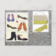 purple,black,brown,chartreuse and red shoes with a matching bag on a white shaggy background. matching mug,note card and postage stamps.