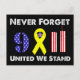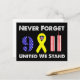 “9 11” in Stars and Strips with the shape of the Twin Towers in New York City, a yellow ribbon, and “Never Forget” “United We Stand” to honour and remember the victims and heroes of September 11, 2001.